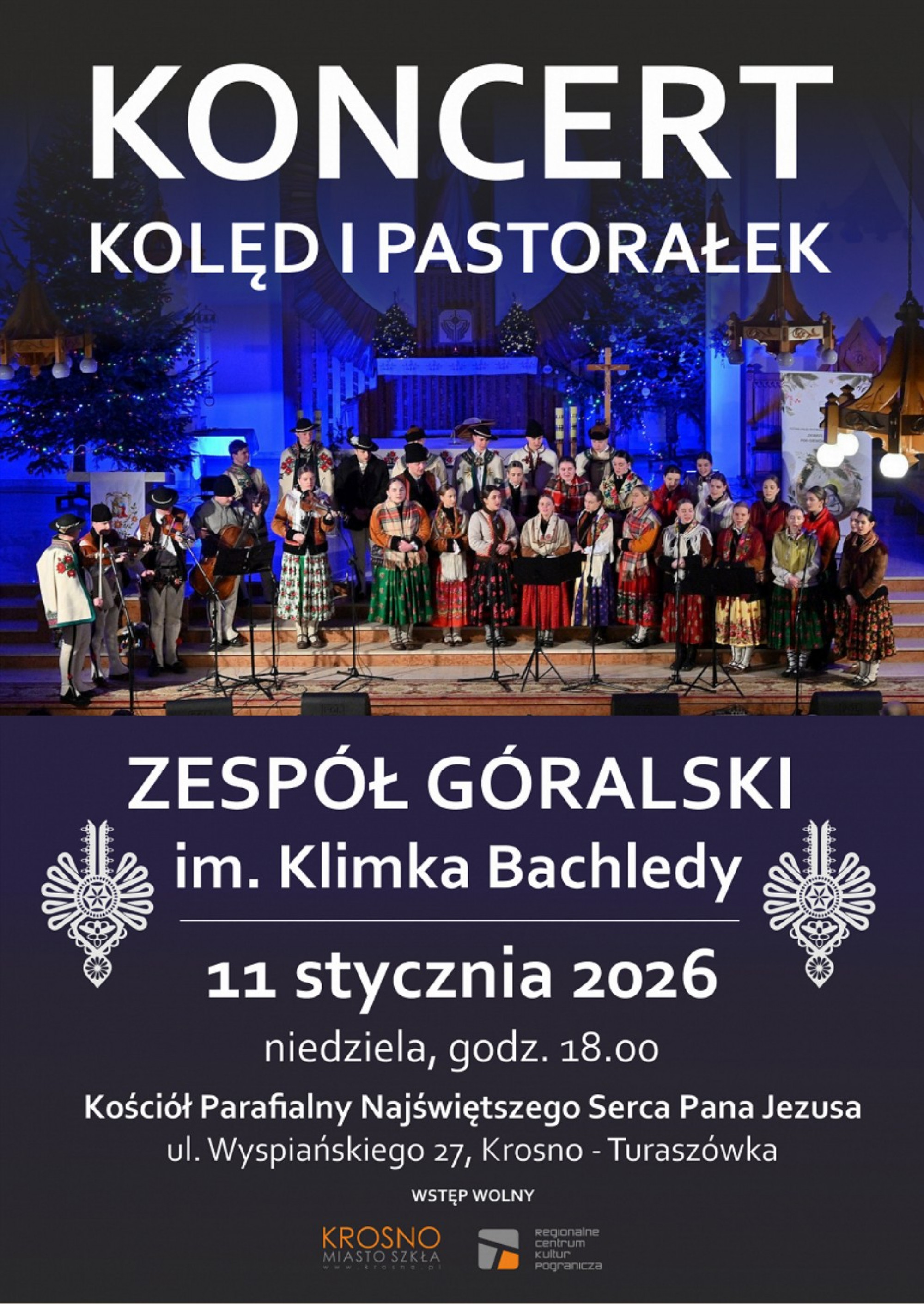 Regionalne Centrum Kultur Pogranicza w Krośnie zaprasza na Koncert Kolęd i Pastorałek w wykonaniu Zespołu Góralskiego im. Klimka Bachledy z Zakopanego. Wydarzenie odbędzie się 11 stycznia (niedziela) o godz. 18.00 w Kościele Parafialnym Najświętszego Serca Pana Jezusa w Krośnie - Turaszówce.