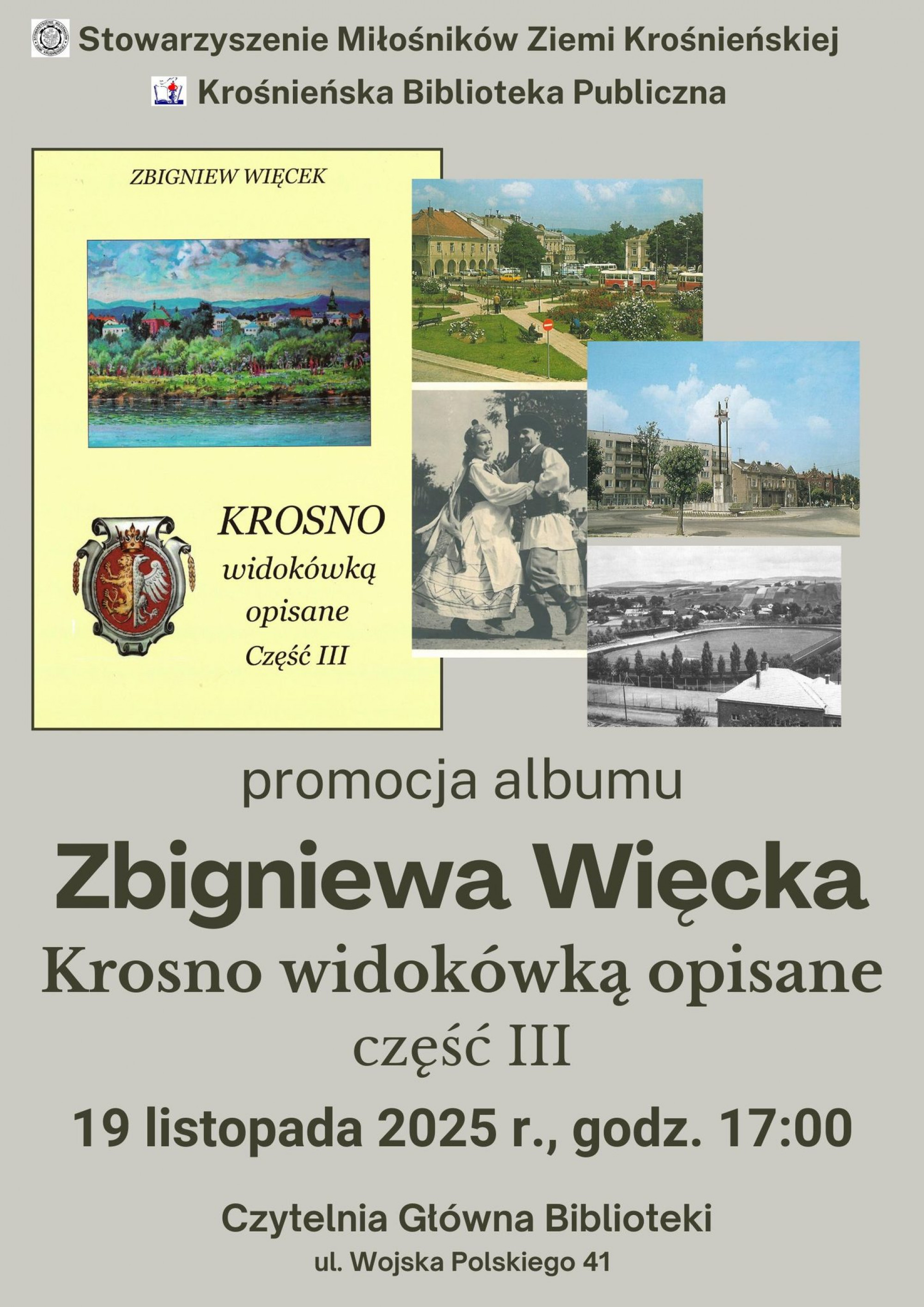Krośnieńska Biblioteka Publiczna i Stowarzyszenie Miłośników Ziemi Krośnieńskiej zapraszają na promocję albumu Zbigniewa Więcka „Krosno widokówką opisane” (część III), która odbędzie się 19 listopada (środa) o godz. 17:00, w Czytelni Głównej Biblioteki (ul. Wojska Polskiego 41).