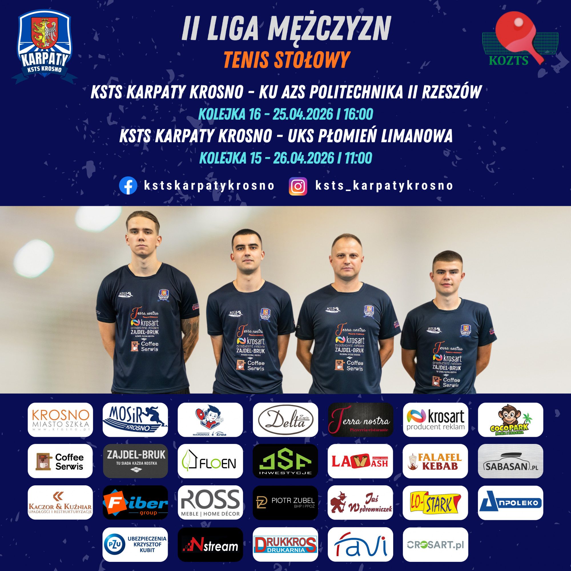 - W najbliższy weekend zakończymy rozgrywki w II lidze męskiej. Brakuje nam jednego zwycięstwa, aby przypieczętować drugie miejsce w ligowej tabeli. Okazję na to będziemy mieli w dwóch domowych meczach, z Politechniką II Rzeszów i Płomień Limanową. Nasze mecze z tymi drużynami zawsze były pasjonujące i tak z pewnością będzie tym razem - mówi przed spotkaniem Kamil Drobek, prezes KSTS Karpaty Krosno. - Serdecznie zapraszamy do spędzenia sobotniego popołudnia i niedzielnego przedpołudnia z tenisem stołowym w Krośnie.