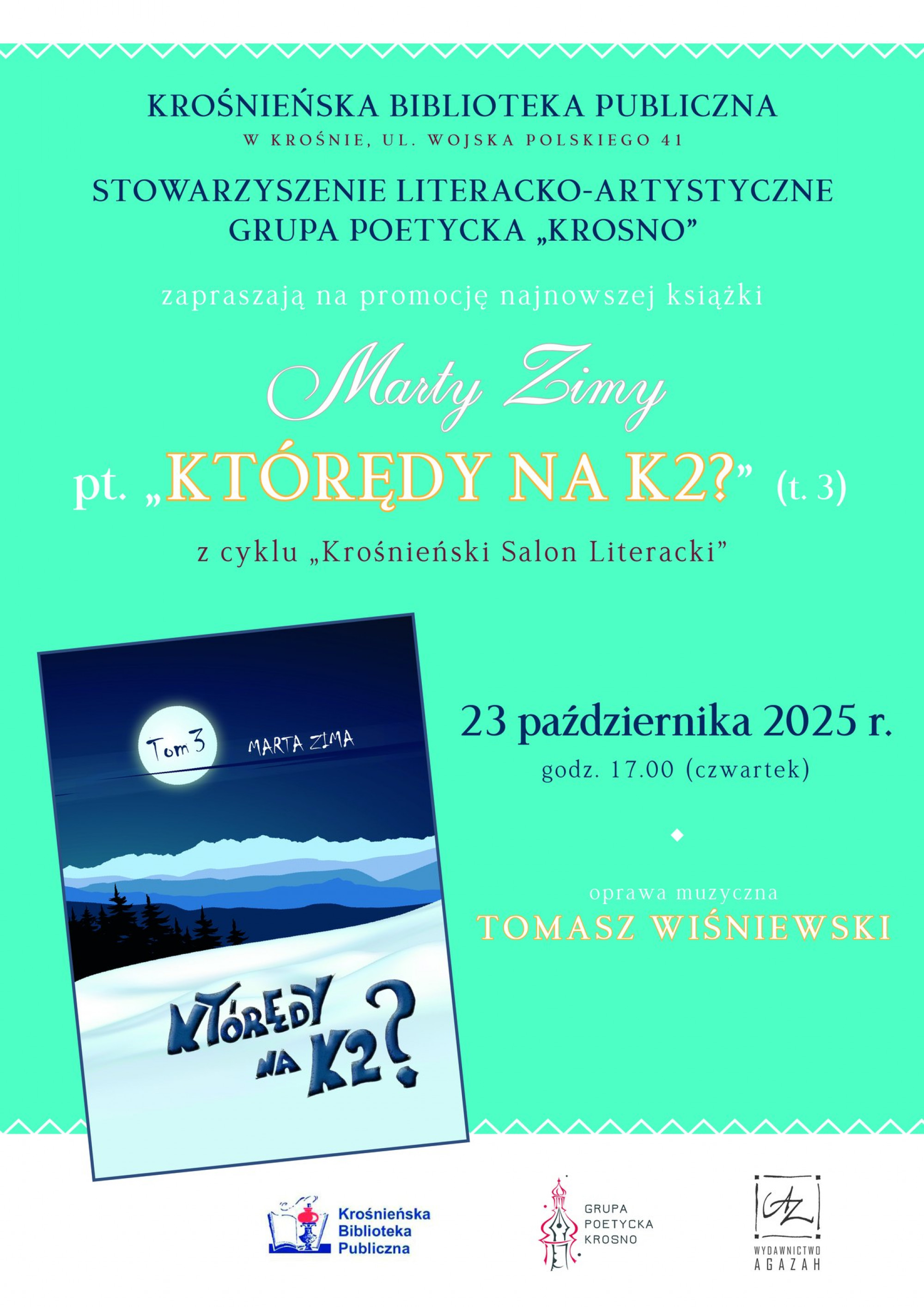 Krośnieńska Biblioteka Publiczna oraz Stowarzyszenie Literacko-Artystyczne Grupa Poetycka "Krosno" zapraszają na prezentację najnowszej książki Marty Zimy „Którędy na K2?” (t.3). Spotkanie odbędzie się 23 października (czwartek) o godz. 17:00 w Saloniku Artystycznym KBP (ul. Wojska Polskiego 41).