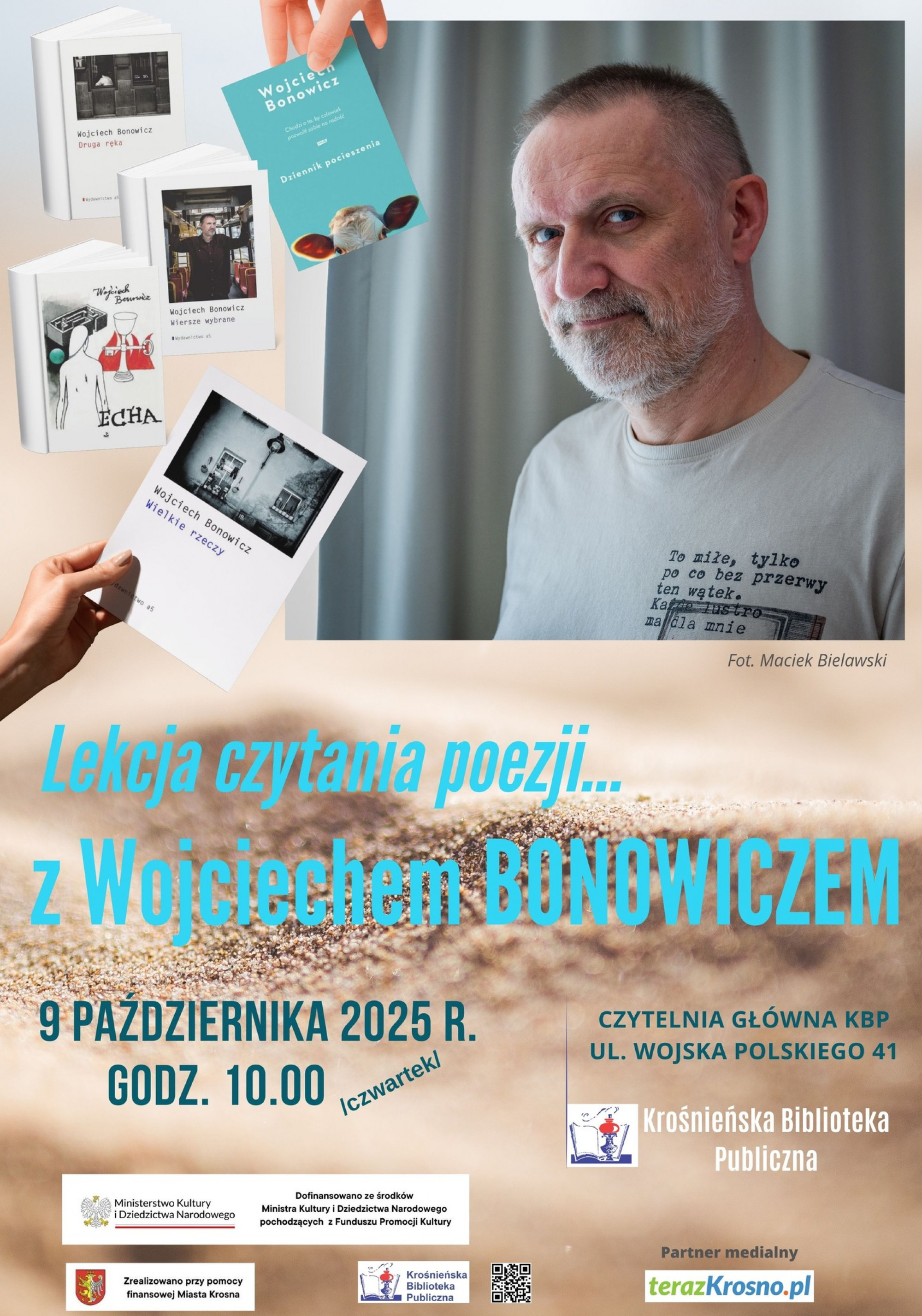 Krośnieńska Biblioteka Publiczna zaprasza na lekcję czytania poezji, którą poprowadzi Wojciech Bonowicz. Spotkanie odbędzie się 9 października (czwartek) o godz. 10.00 w Krośnieńskiej Bibliotece Publicznej (ul. Wojska Polskiego 41).