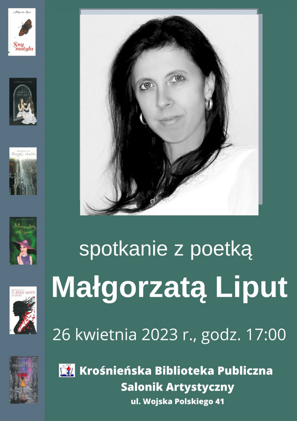 Krośnieńska Biblioteka Publiczna zaprasza na spotkanie z poezją Małgorzaty Liput, które odbędzie się 26 kwietnia (środa) o godz. 17:00 w Saloniku Artystycznym KBP (ul. Wojska Polskiego 41).