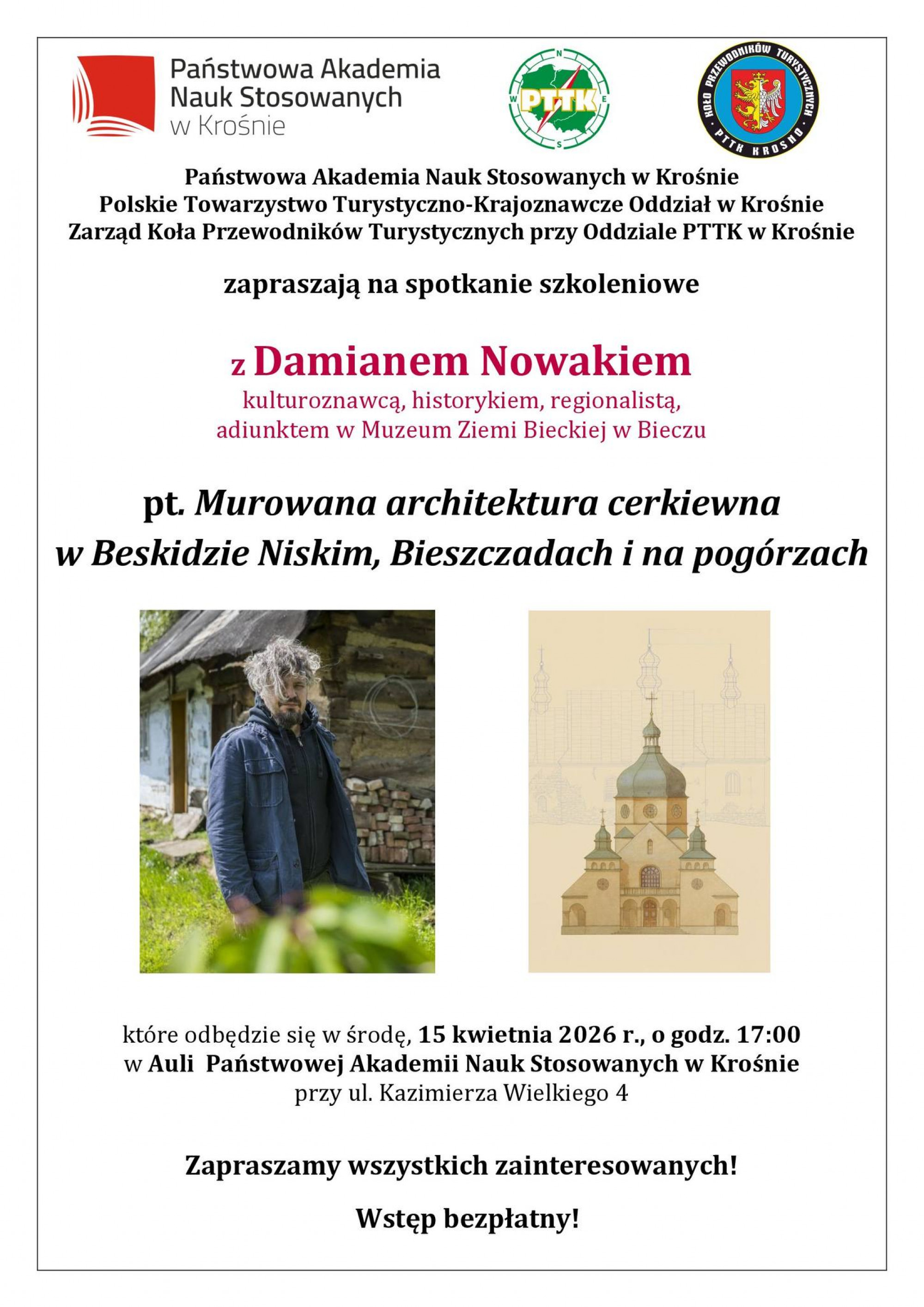Państwowa Akademia Nauk Stosowanych w Krośnie, Polskie Towarzystwo Turystyczno-Krajoznawcze oddział w Krośnie oraz Zarząd Koła Przewodników Turystycznych przy PTTK Krosno zapraszają na kolejne spotkanie szkoleniowe. Tym razem gościem wydarzenia będzie Damian Nowak.