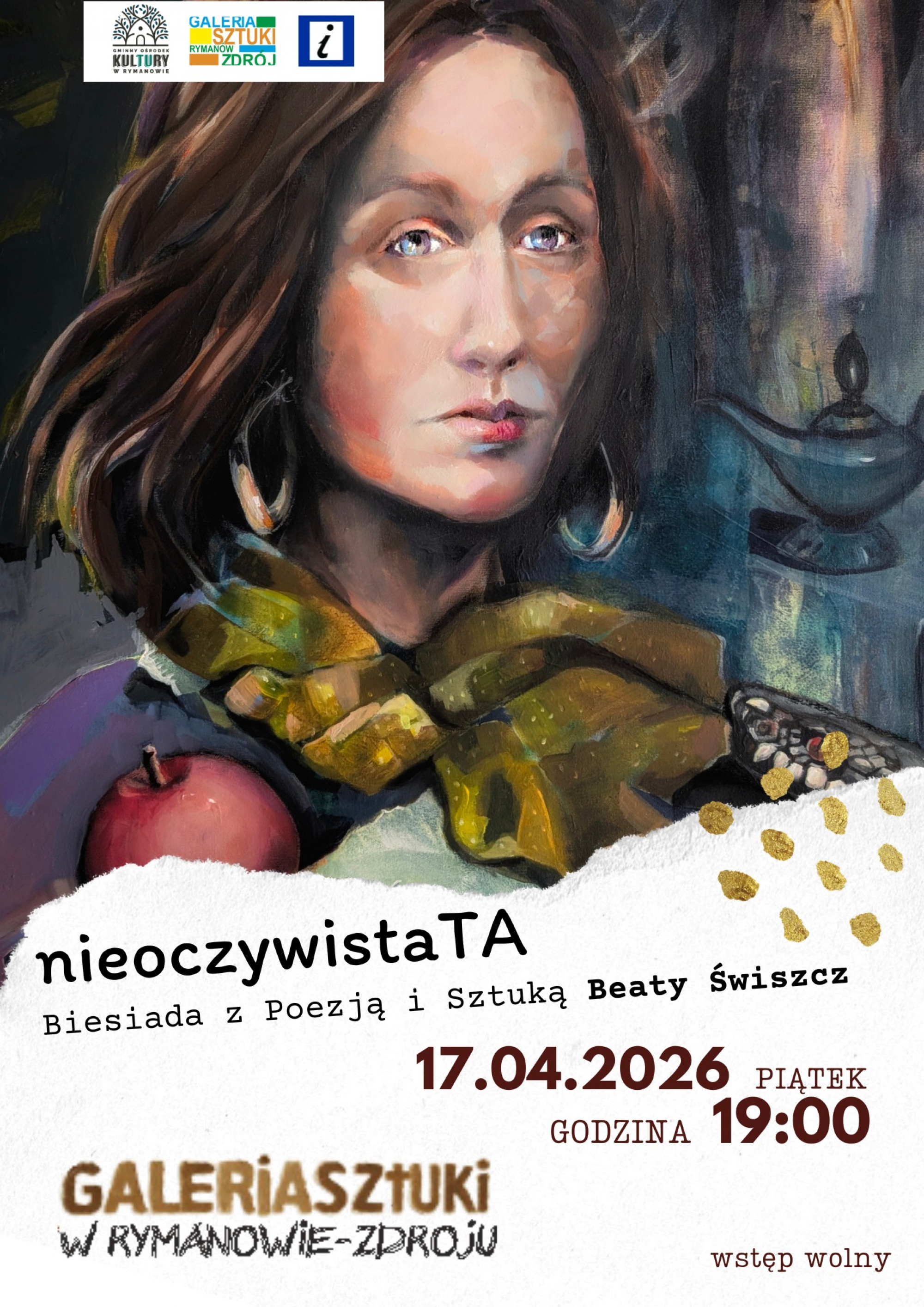 Biuro Informacji Turystycznej w Rymanowie-Zdroju zaprasza na biesiadę z poezją i sztuką Beaty Świszcz pt. "nieoczywisTA". Spotkanie odbędzie się 17 kwietnia (piątek) o godz. 19:00 w Galerii Sztuki w Rymanowie-Zdroju.