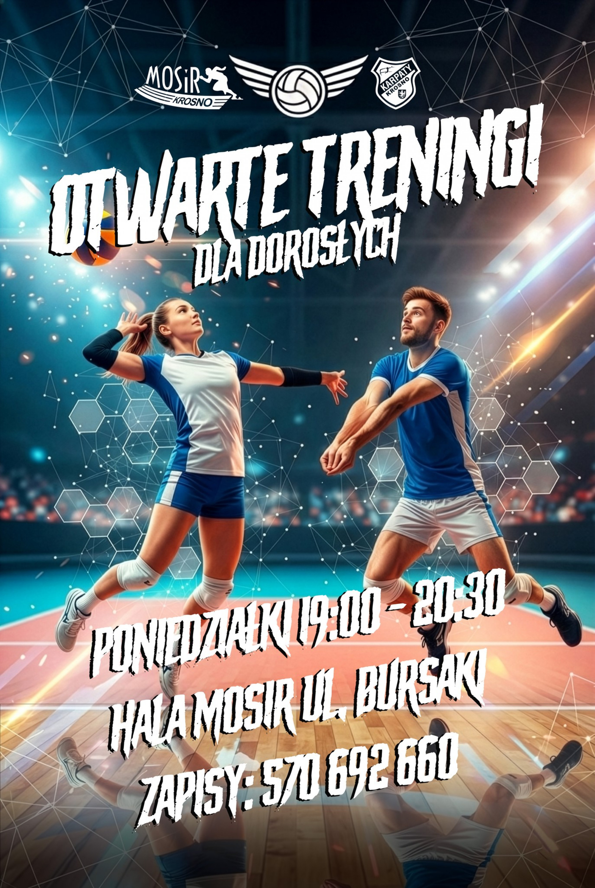 Krośnieńskie Stowarzyszenie Siatkówki Karpaty Krosno oraz Miejski Ośrodek Sportu i Rekreacji w Krośnie zapraszają na Otwarte Treningi Siatkówki dla Dorosłych. Zajęcia będą odbywać się regularnie od marca - w każdy poniedziałek w godzinach 19:00-20:30 w Hali MOSiR (Krosno, ul. Bursaki 29).