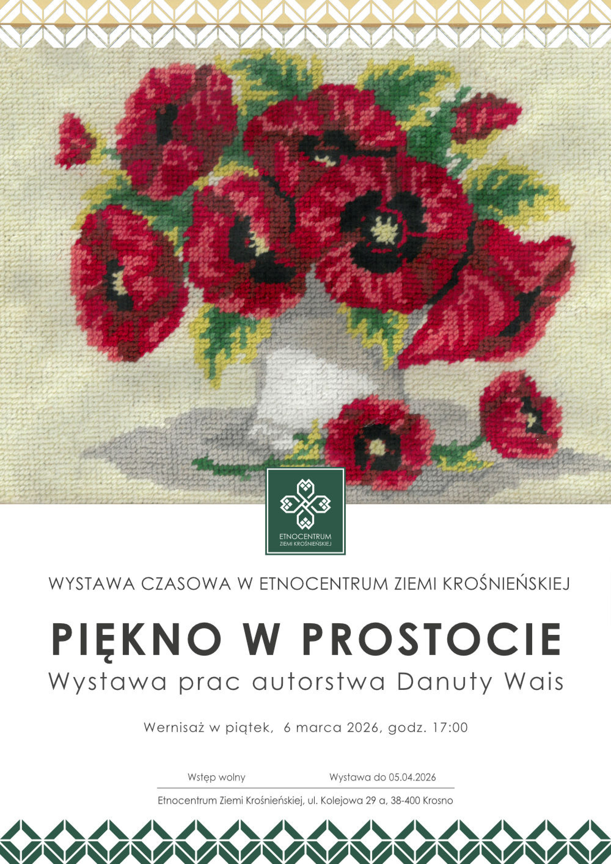 Etnocentrum Ziemi Krośnieńskiej zaprasza na wystawę "Piękno w prostocie", którą w marcu będzie można oglądać w Galerii wystaw czasowych. Ekspozycja prezentuje prace Danuty Wais wykonane w technikach haftu krzyżykowego, akwareli i akrylu. Wernisaż odbędzie się 6 marca 2026 (piątek) o godz. 17:00.