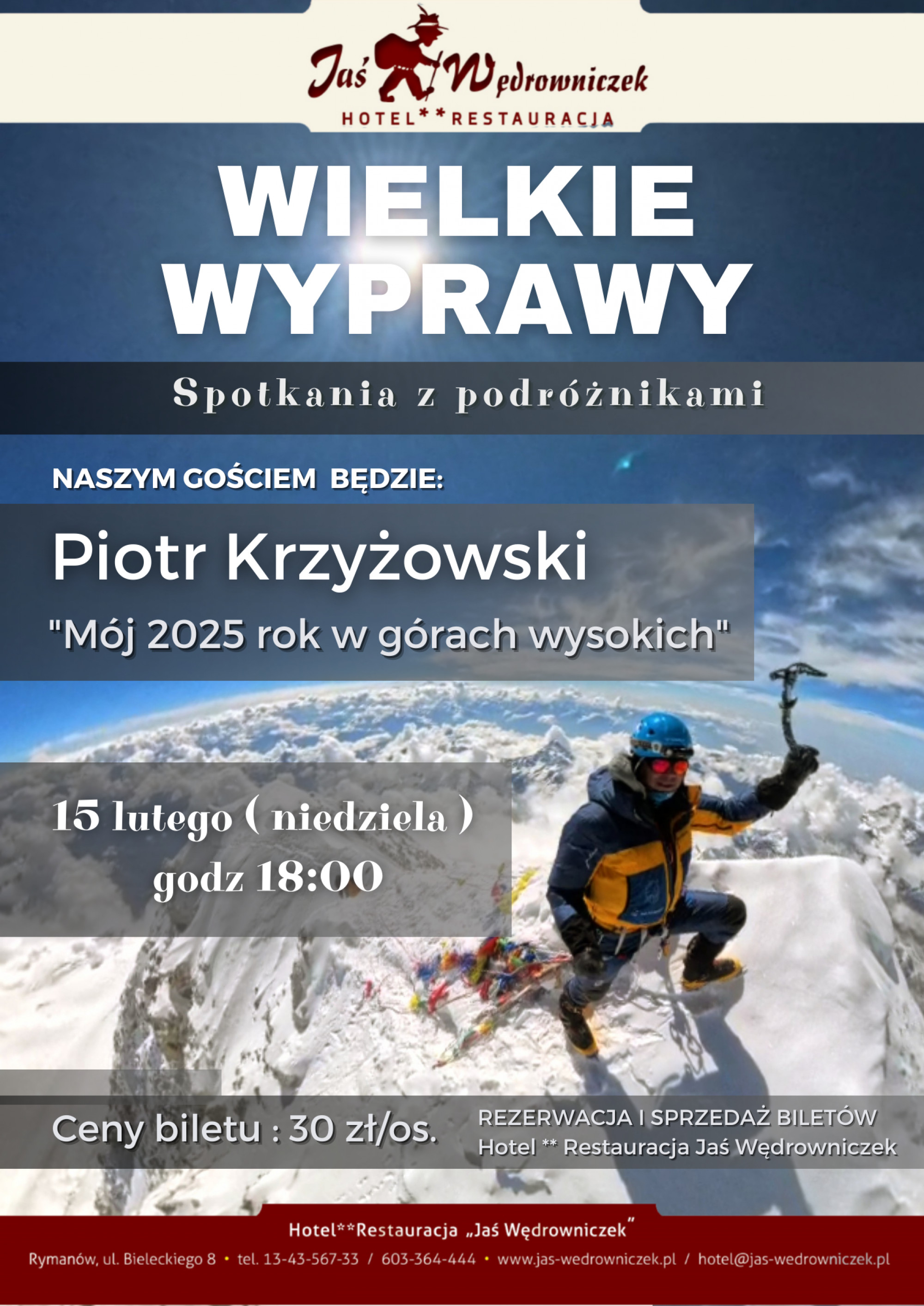 Hotel Restauracja Jaś Wędrowniczek zachęca do udziału w kolejnym spotkaniu w ramach cyklu "Wielkie Wyprawy - Spotkania z Podróżnikami", które odbędzie się 15 lutego (niedziela) o godz. 18:00: - Tym razem zapraszamy na spotkanie z człowiekiem, który przesunął granice ludzkiej wytrzymałości.