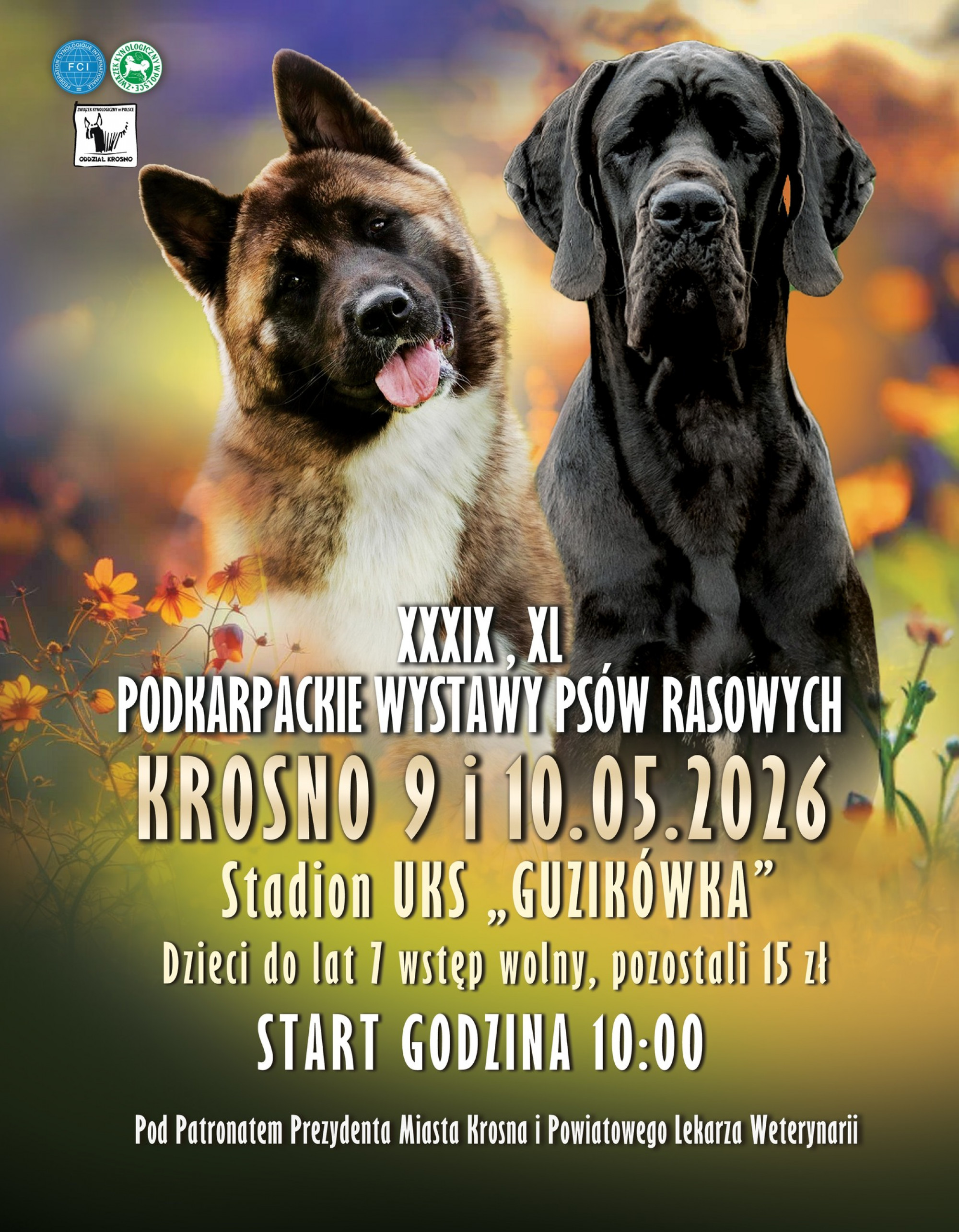 Związek Kynologiczny w Polsce Oddział w Krośnie zaprasza na XXIX i XL Podkarpacką Wystawę Psów Rasowych, które odbędą się 9 i 10 maja (sobota - niedziela) na Stadionie UKS Guzikówka (Krosno, ul. Ostaszewskiego 7). Początek prezentacji o godz. 10:00.
