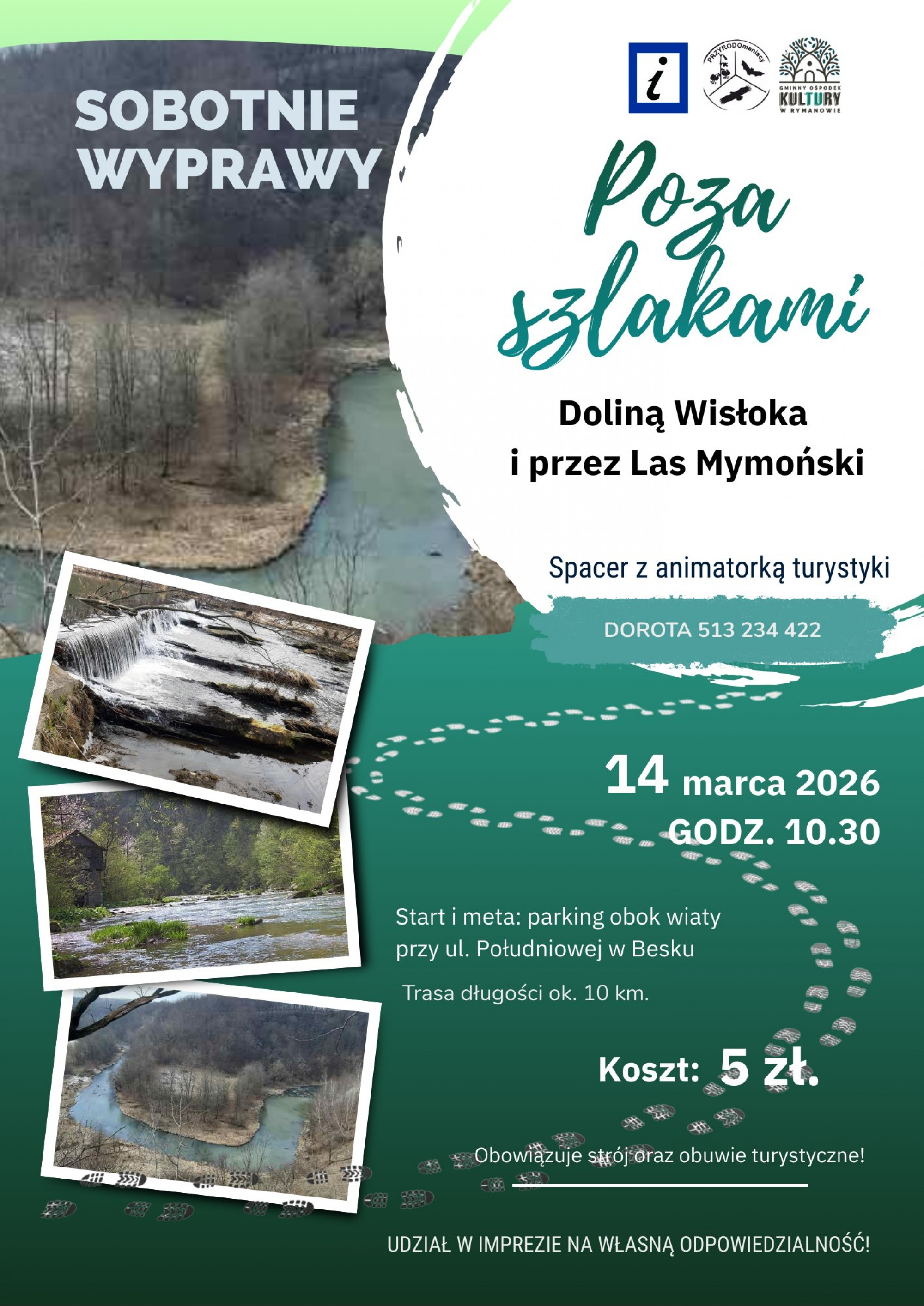 Biuro Informacji Turystycznej w Rymanowie-Zdroju oraz PRZYRODOmaniacy zapraszają na kolejną edycję spaceru "Poza szlakami". Tym razem organizatorzy proponują przejście Doliną Wisłoka i przez Las Mymoński.