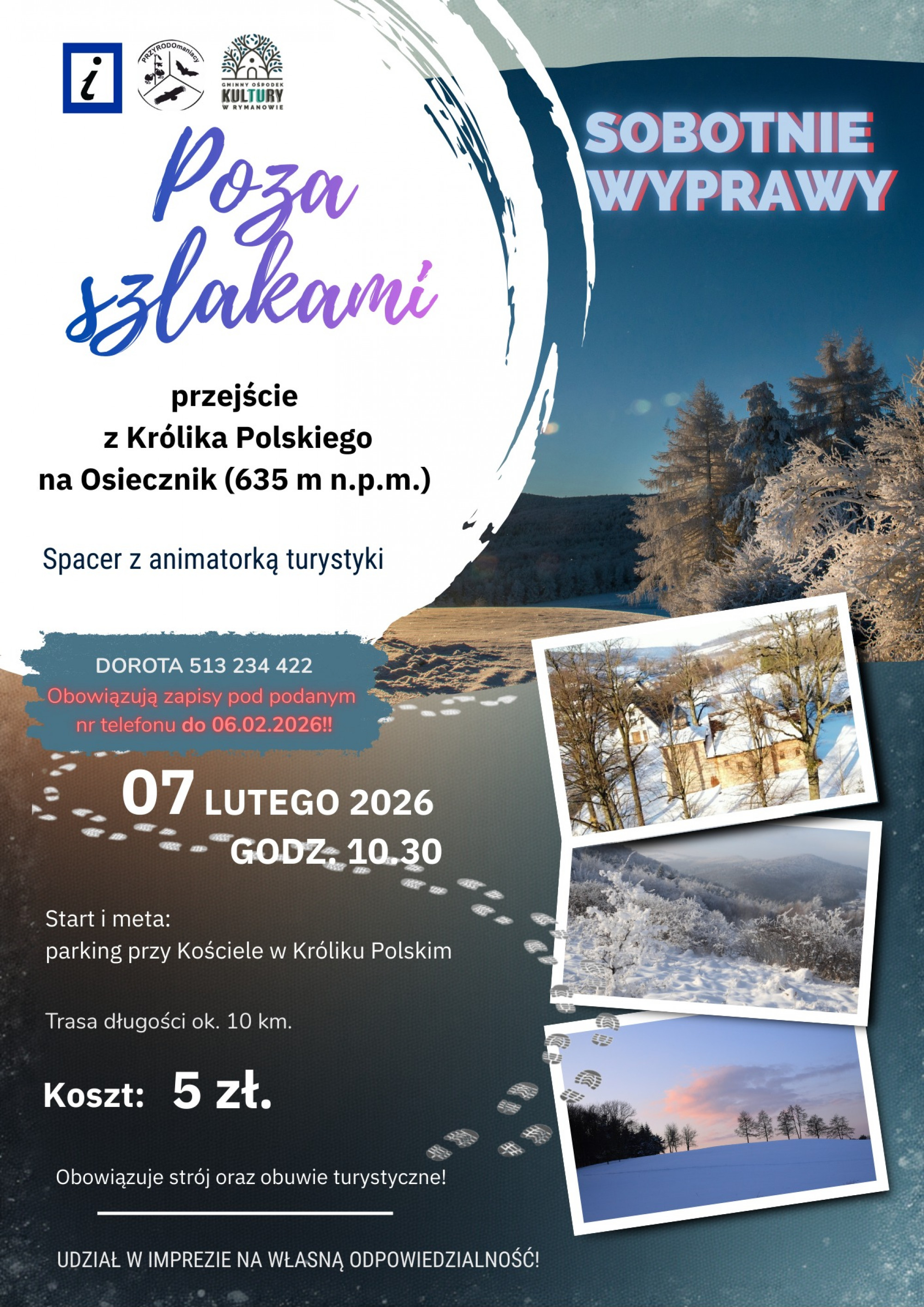 Biuro Informacji Turystycznej w Rymanowie-Zdroju oraz PRZYRODOmaniacy zapraszają na kolejną edycję spaceru "Poza szlakami". Tym razem organizatorzy proponują przejście trasą widokową z Królika Polskiego na Osiecznik (635 m n.p.m.). To drugi termin tej wycieczki, w pierwszym nie odbyła się z powodu dużych opadów śniegu.
