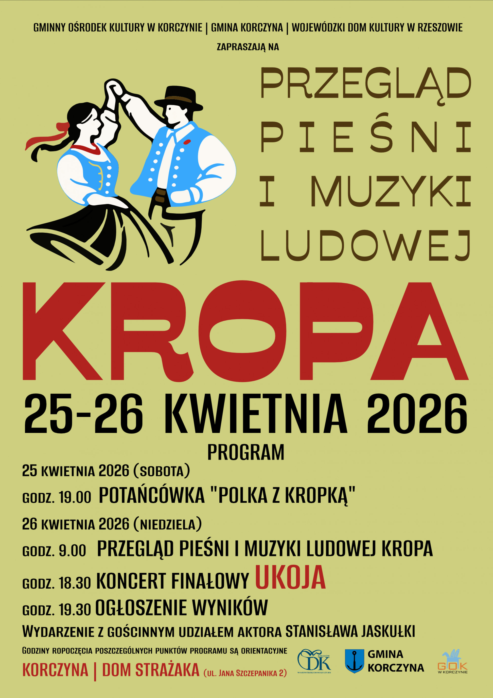 Korczyna kolejny raz stanie się centrum muzyki ludowej regionu. Już w dniach 25–26 kwietnia (sobota - niedziela) odbędzie się XXIII Przegląd Pieśni i Muzyki Ludowej „XLII KROPA” – wydarzenie, które od lat przyciąga twórców i miłośników folkloru z całego Podkarpacia.