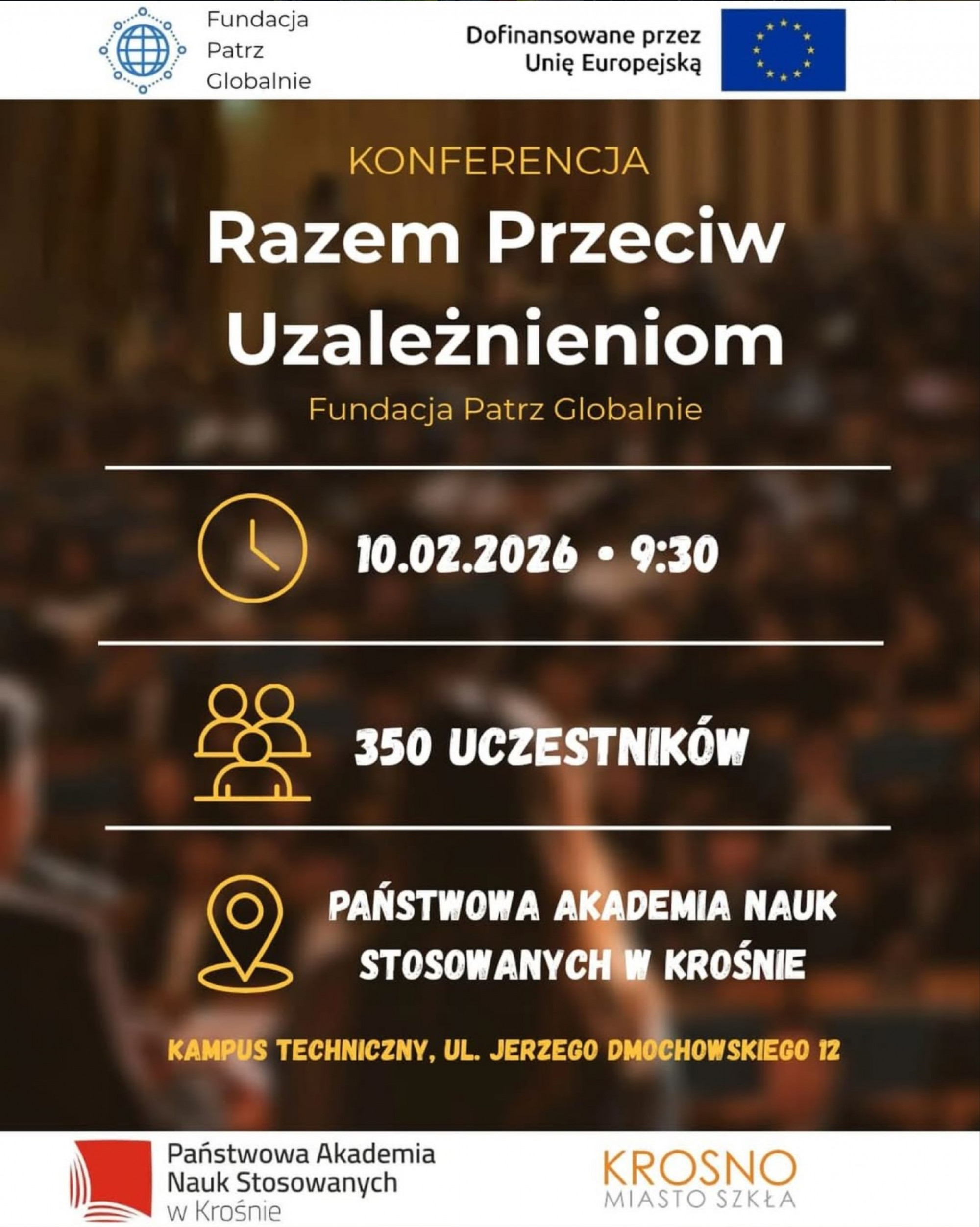 Fundacja Patrz Globalnie zaprasza uczniów oraz nauczycieli szkół średnich do udziału w konferencji poświęconej problematyce uzależnień, która odbędzie się 10 lutego (wtorek) w Kampusie Politechnicznym PANS (Krosno, ul. Dmochowskiego 12).