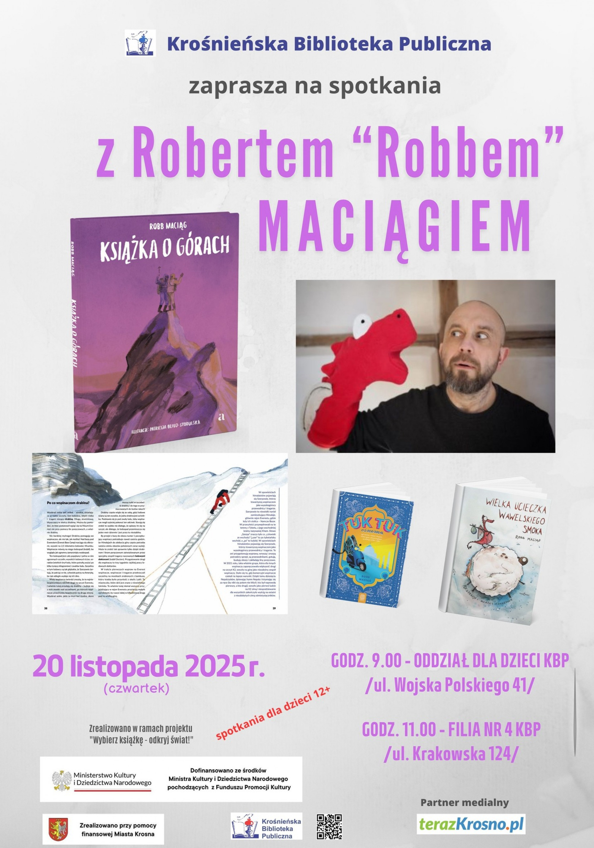 Krośnieńska Biblioteka Publiczna zaprasza dzieci na spotkanie z Robertem Maciągiem. Odbędą się one 20 listopada (czwartek) o godz. 9.00 w Oddziale dla Dzieci (ul. Wojska Polskiego 41) i o godz. 11.00 w Filii nr 4 (ul. Krakowska 124).