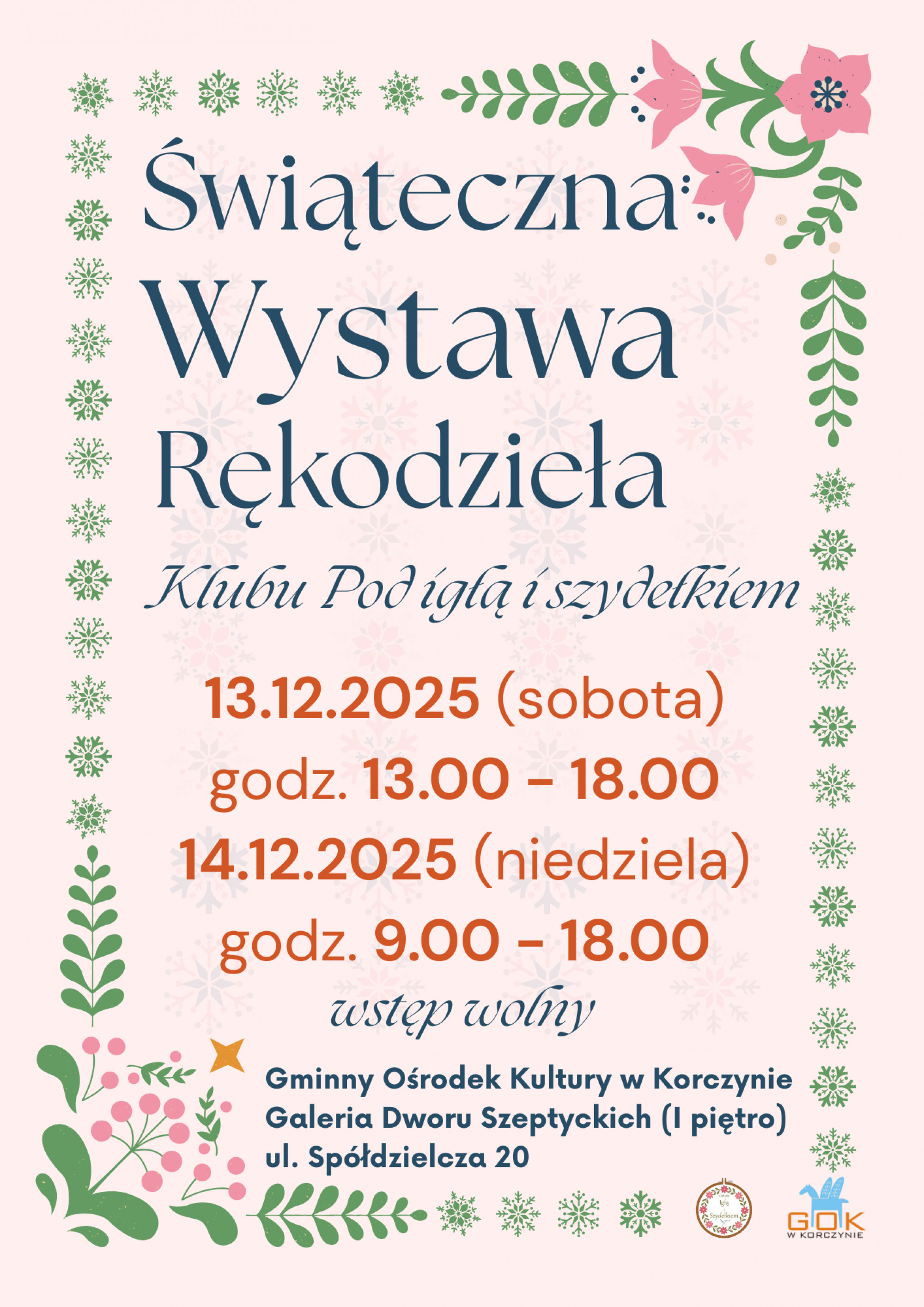 Gminny Ośrodek Kultury w Korczynie zaprasza miłośników pięknych, ręcznie tworzonych ozdób na Świąteczną Wystawę Rękodzieła Klubu „Pod Igłą i Szydełkiem”, która odbędzie się 13–14 grudnia (sobota - niedziela) w klimatycznej Galerii Dworu Szeptyckich.