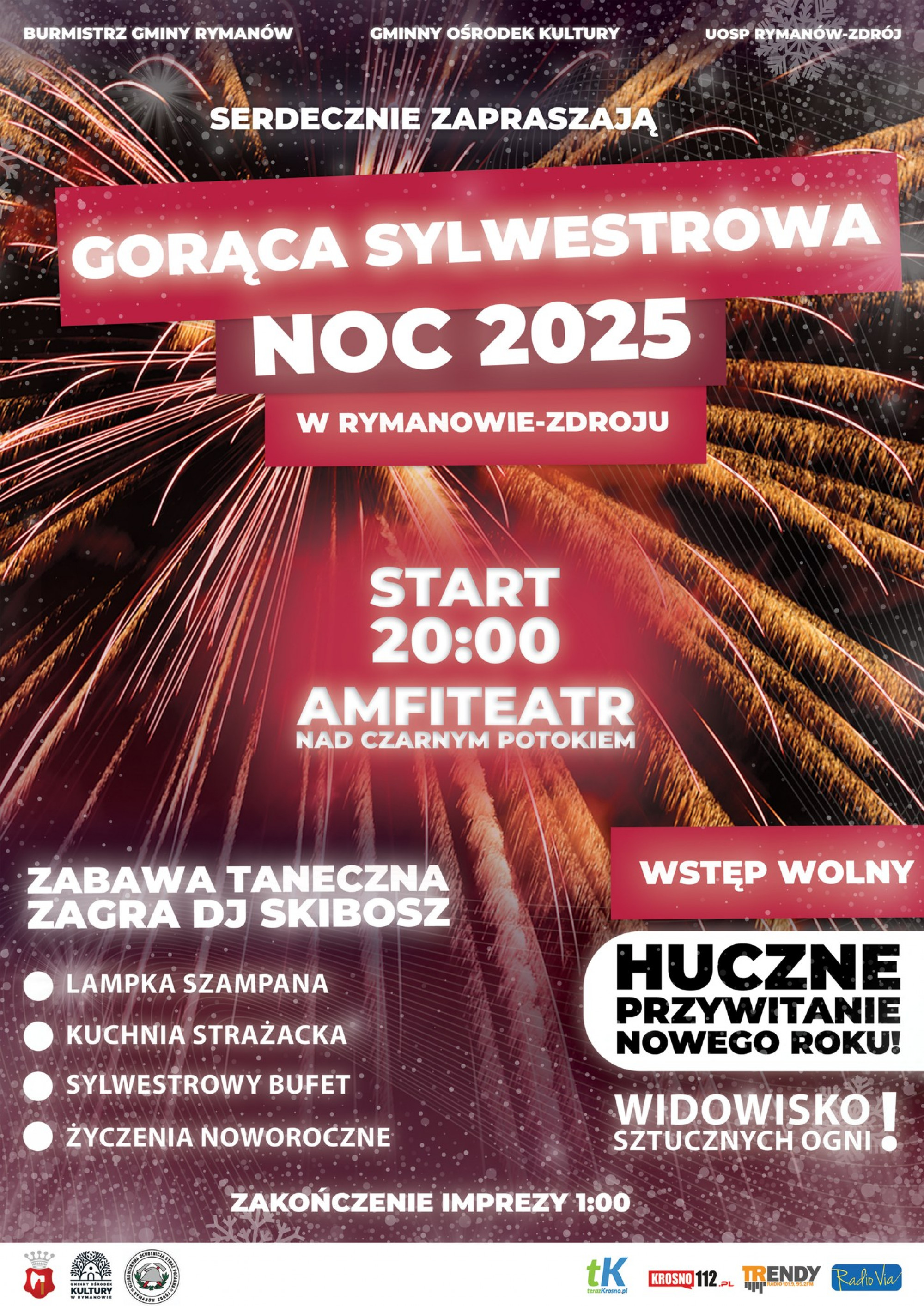 Burmistrz Gminy Rymanów, Gminny Ośrodek Kultury w Rymanowie oraz Uzdrowiskowa Ochotnicza Straż Pożarna w Rymanowie-Zdroju zapraszają na Gorącą Sylwestrową Noc 2025 w Rymanowie-Zdroju: - 31 grudnia zapraszamy Was na wyjątkową, pełną energii i radości sylwestrową imprezę pod gwiazdami. Czeka nas szampańska zabawa, świetna muzyka i huczne powitanie Nowego Roku!