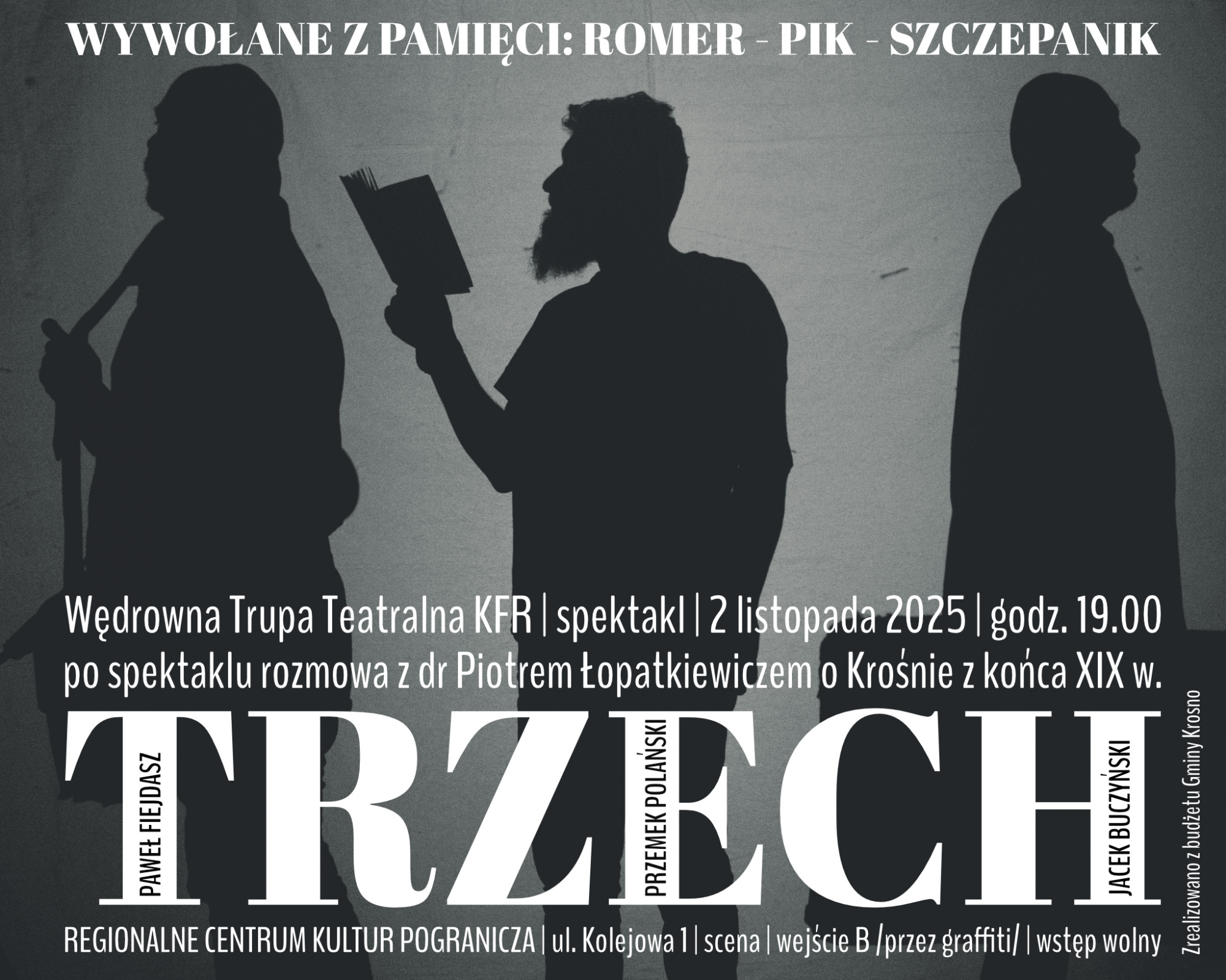 Krośnieńska Fundacja Rozwoju zaprasza na spektakl "Trzech" w reżyserii Jacka Buczyńskiego, który odbędzie się 2 listopada (niedziela) o godz. 19:00 w Regionalnym Centrum Kultur Pogranicza w Krośnie.