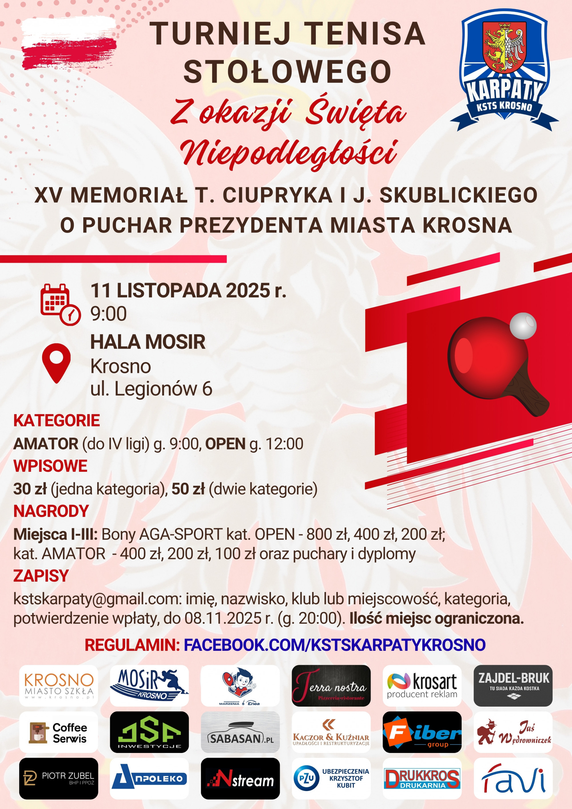 Krośnieńskie Stowarzyszenia Tenisa Stołowego zaprasza do wzięcia udziału w XV Turnieju o Puchar Prezydenta Miasta Krosna (Memoriał T. Ciupryka i J. Skublickiego). Zawody zostały zaplanowane na Święto Niepodległości (11 listopada).