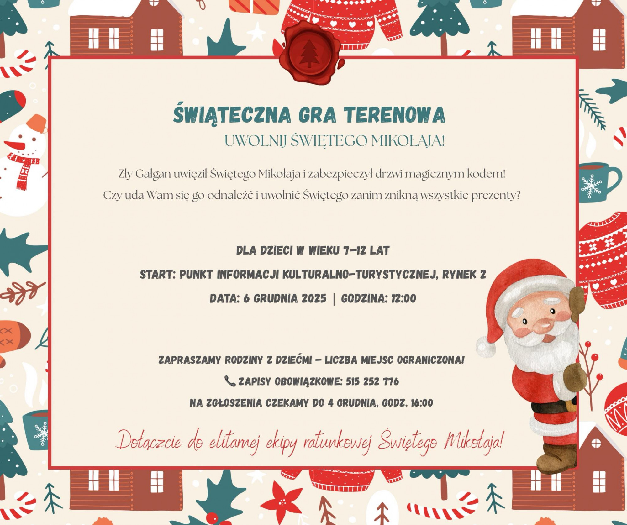 Punkt Punkt Informacji Kulturalno-Turystycznej w Krośnie zaprasza do udziału w świątecznej grze terenowej "Uwolnij Świętego Mikołaja". Zabawa skierowana jest do rodzin z dziećmi w wieku 7-12 lat, a zaplanowano ją na sobotę (6 grudnia). Start o godz. 12:00 w PIKT (Rynek 2).