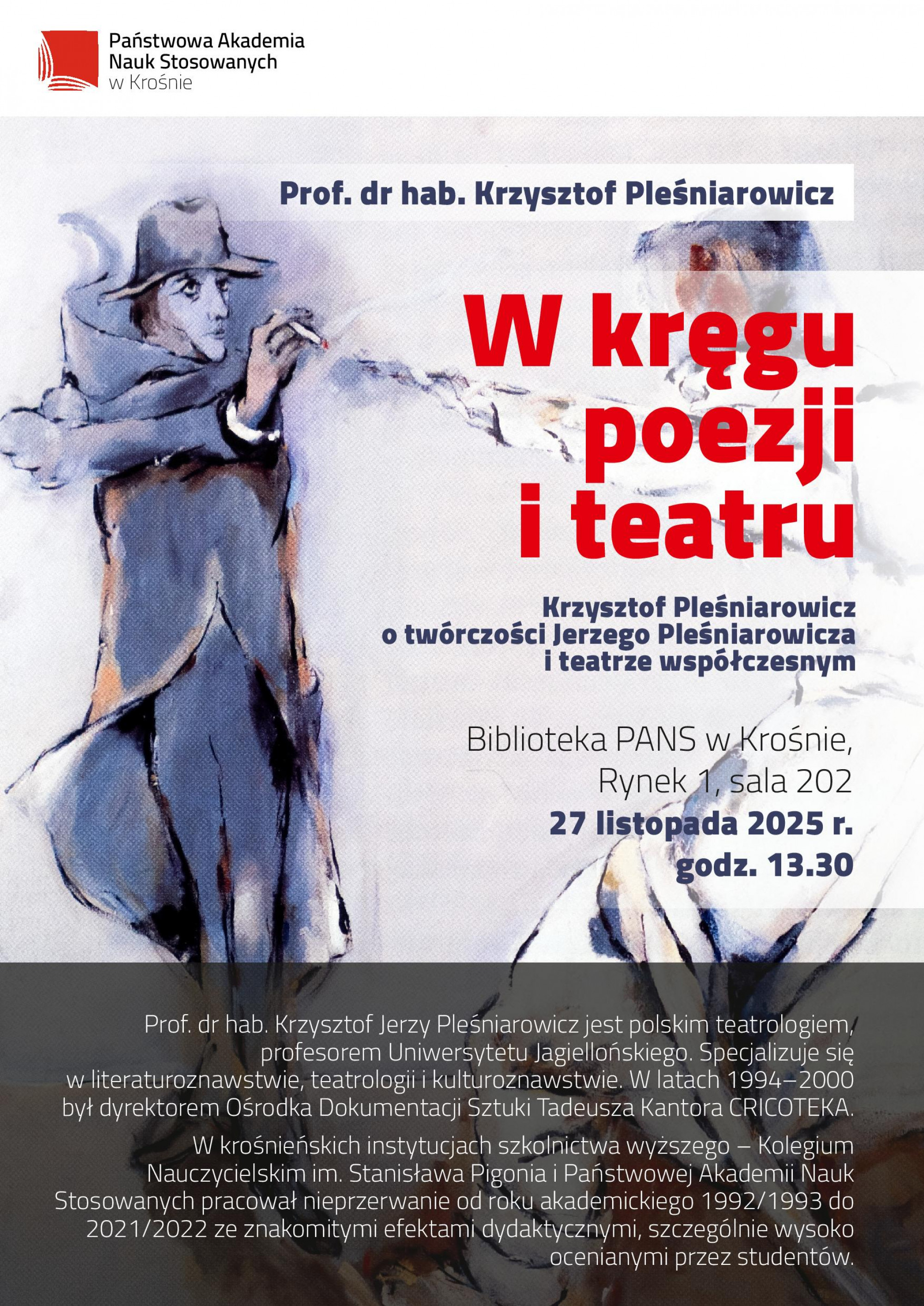 Państwowa Akademia Nauk Stosowanych w Krośnie zaprasza do udziału w wykładzie profesora Krzysztofa Pleśniarowicza pt. "W kręgu poezji i teatru. Krzysztof Pleśniarowicz o twórczości Jerzego Pleśniarowicza i teatrze współczesnym".