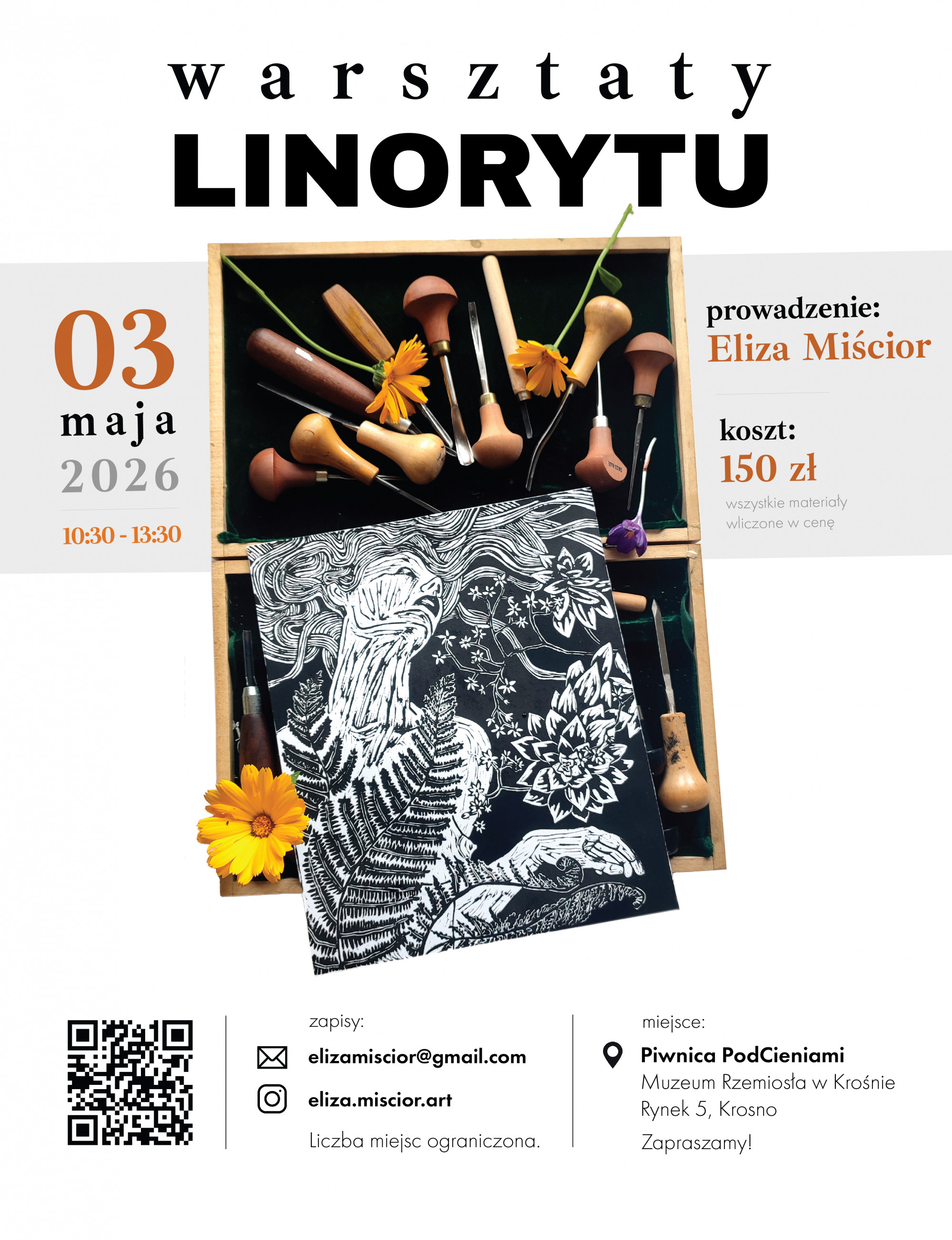 3 maja 2026 (niedziela) o godz. 10:30 w Piwnicy PodCieniami Muzeum Rzemiosła w Krośnie (Rynek 5) odbędą się warsztaty linorytu. Poprowadzi je graficzka i malarka Eliza Miścior.