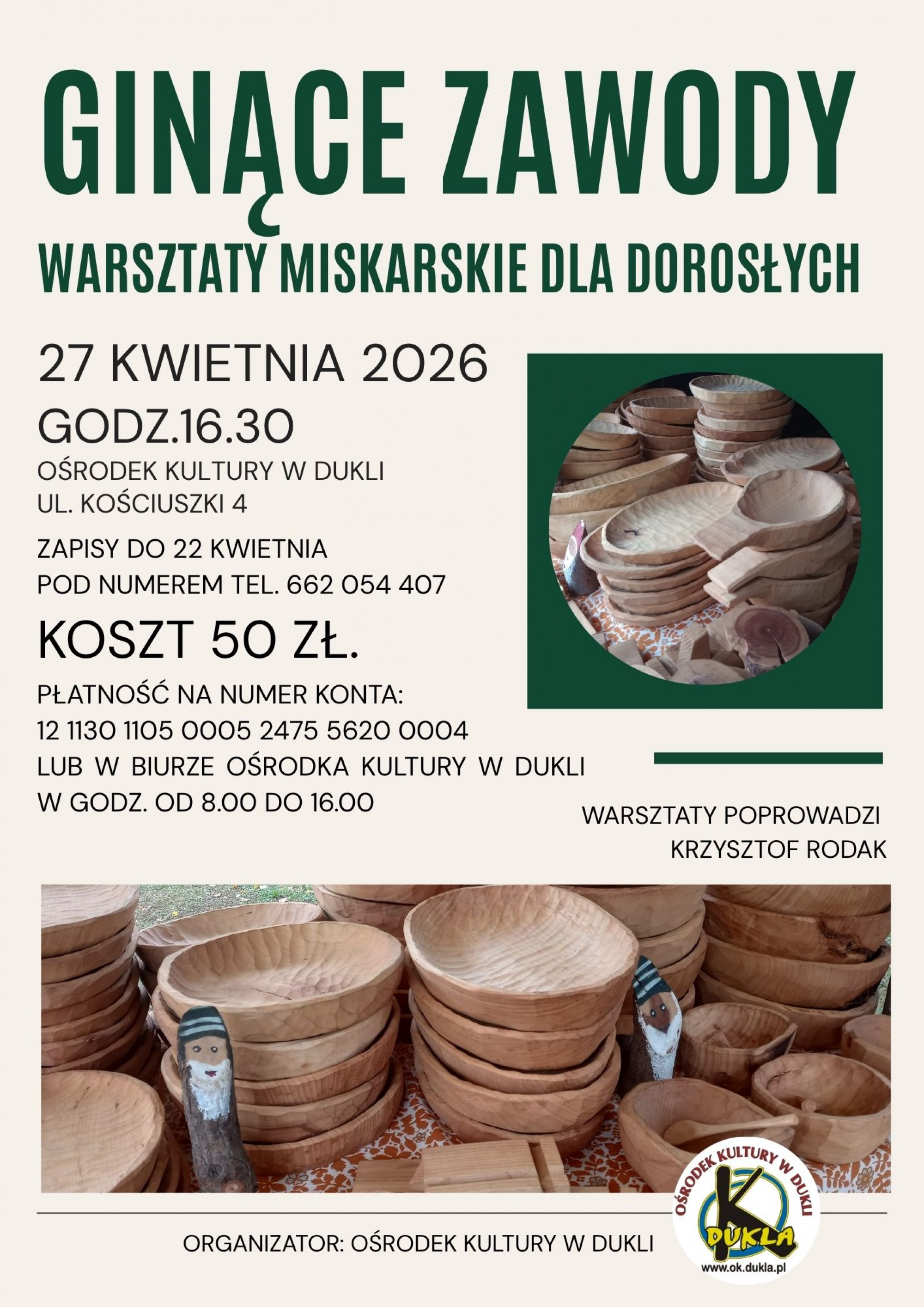 "Ginące Zawody" - Ośrodek Kultury w Dukli zaprasza na warsztaty miskarskie, które odbędą się 27 kwietnia (poniedziałek) o godz. 16:30.