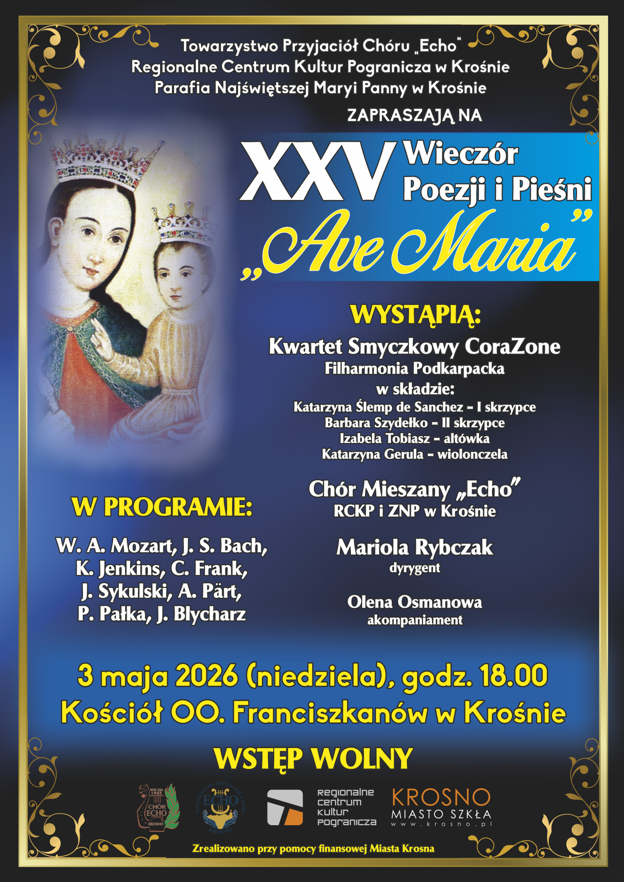 Towarzystwo Przyjaciół Chóru „Echo”, Regionalne Centrum Kultur Pogranicza w Krośnie oraz Parafia Najświętszej Maryi Panny zapraszają na XXV Wieczór Poezji i Pieśni „Ave Maria” - wydarzenie o wieloletniej tradycji, które od lat zajmuje ważne miejsce w kulturalnym życiu Krosna i w tegorocznej odsłonie łączy śpiew chóralny z brzmieniem kwartetu smyczkowego.