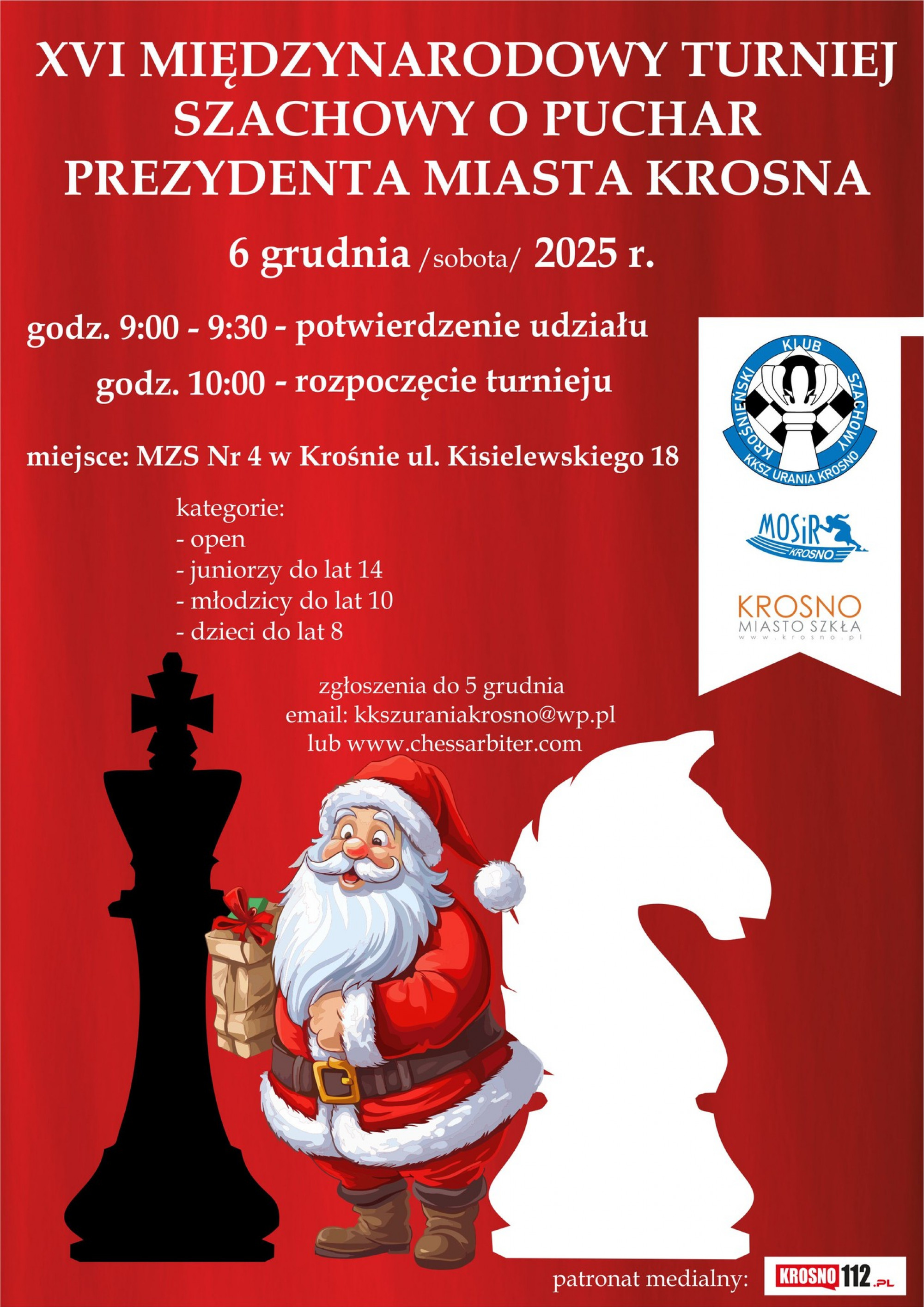 Krośnieński Klub Szachowy Urania Krosno i Miejski Ośrodek Sportu i Rekreacji w Krośnie zapraszają na XVI Międzynarodowy Turniej Szachowy o Puchar Prezydenta Miasta Krosna.