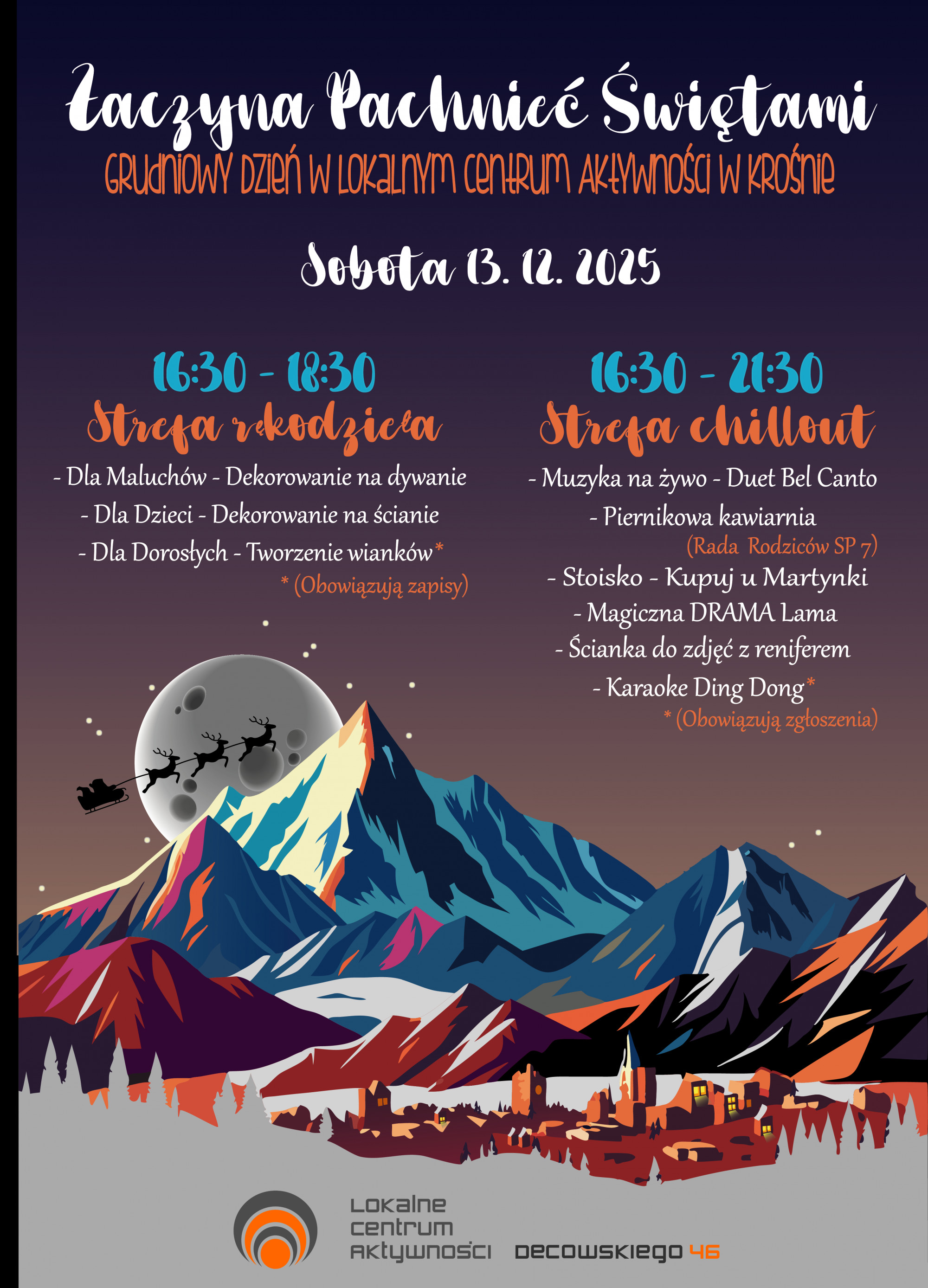 Zaczyna Pachnieć Świętami to wyjątkowe wydarzenie, które pozwoli zagłębić się w prawdziwie świątecznym nastroju. Odbędzie się 13 grudnia (sobota) w kameralnym, specjalnie udekorowanym na tę okazję nastrojowym zakątku Lokalnego Centrum Aktywności, gdzie pod okiem instruktorów, uczestnicy będą mogli spełnić się artystycznie.