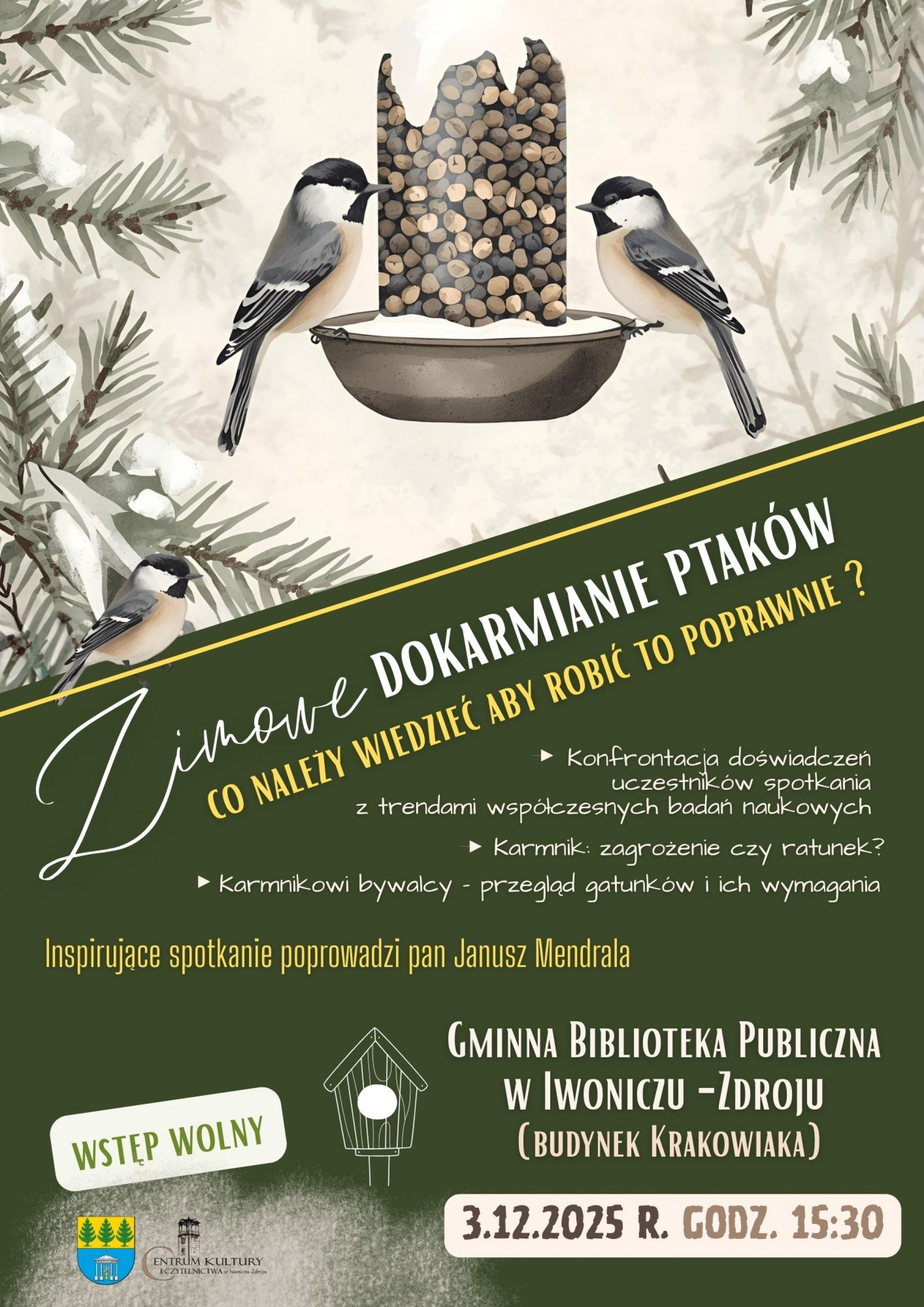Centrum Kultury i Czytelnictwa w Iwoniczu-Zdroju zaprasza na spotkanie "Zimowe dokarmianie ptaków", które odbędzie się 3 grudnia (środa) o godz. 15:30 w Gminnej Bibliotece Publicznej w Iwoniczu-Zdroju (budynek Krakowiaka).