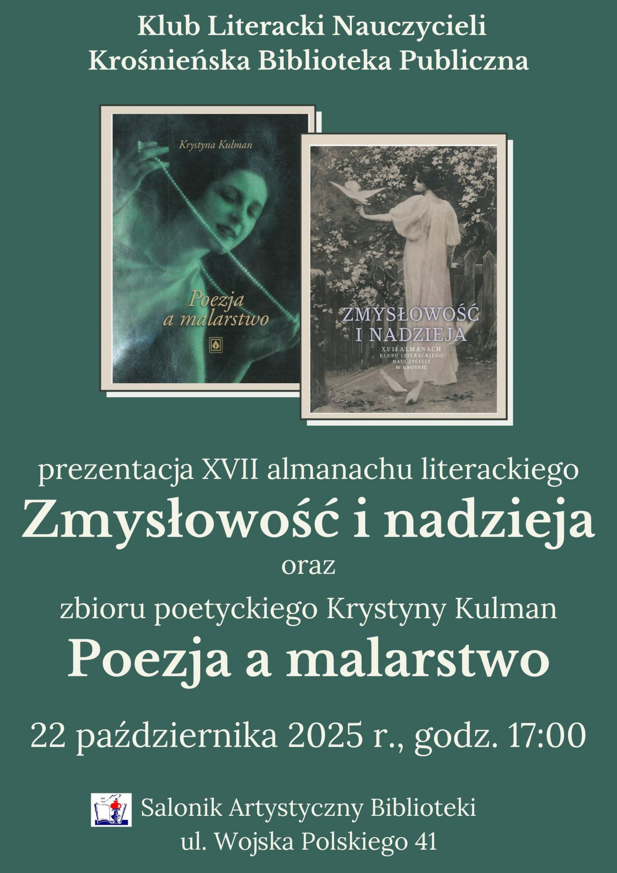 Krośnieńska Biblioteka Publiczna oraz Klub Literacki Nauczycieli zapraszają na prezentację XVII almanachu literackiego „Zmysłowość i nadzieja” oraz zbioru poetyckiego Krystyny Kulman „Poezja a malarstwo”.