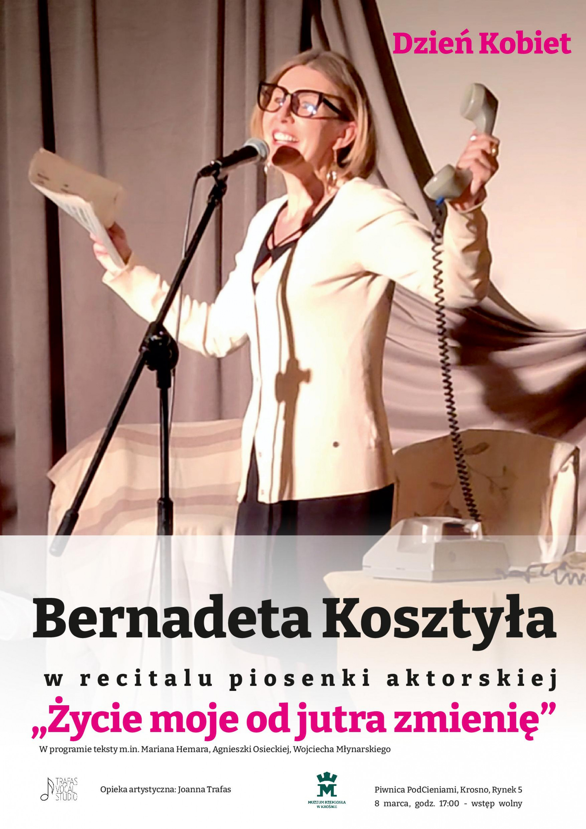 Muzeum Rzemiosła w Krośnie zaprasza z okazji Dnia Kobiet na recital piosenki aktorskiej Bernadety Kosztyły pt. ”Życie moje od jutra zmienię”. Koncert odbędzie się w niedzielę (8 marca) o godz. 17.00 w Piwnicy PodCieniami (ul. Rynek 5).